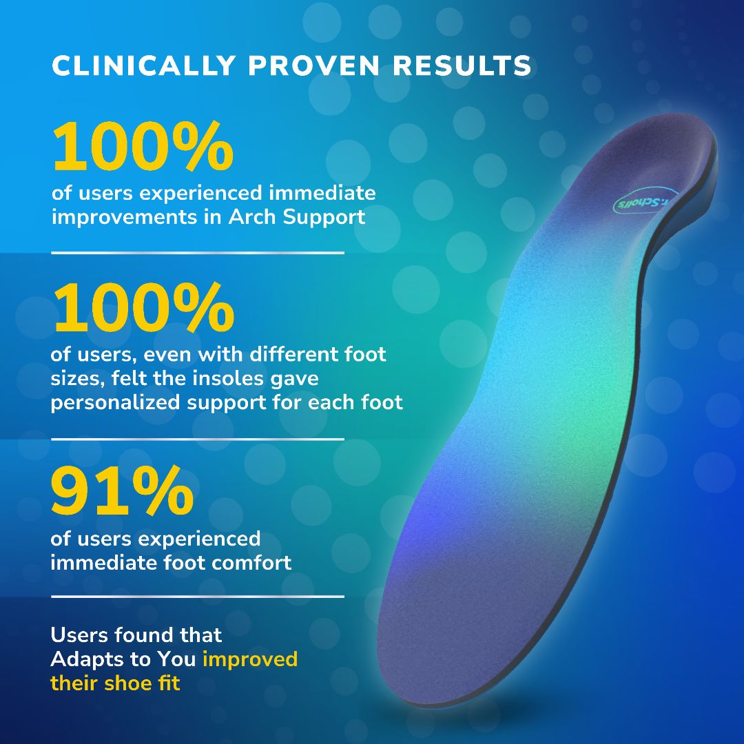 Meet Dr. Scholl's® Adapts To You Insoles with NEW 360° Self-Molding Technology – the perfect blend of comfort, convenience, and arch support for all-day support, no matter your foot shape or size. Designed for busy individuals who need a quick solution for tired, achy feet, these insoles take the guesswork out of foot support by adapting to your feet within 7 days, reducing stress and pressure on your feet and supporting your natural way of moving. You don’t need to know your arch type or foot measurements for an exact fit – just trim, slip into your shoes and experience the difference.