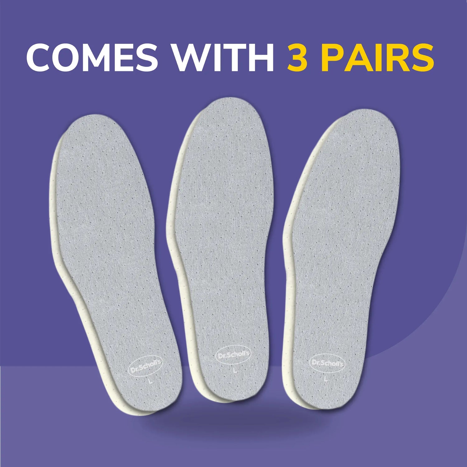 Dr. Scholl’s® Go Sockless! Insoles provide all-day cushioning and moisture protection so you can go sockless with confidence. These insoles are designed with a plush terrycloth top layer and vented stabilizing foam to help keep feet cool, dry and comfortable. No sweat. No show. No problem!