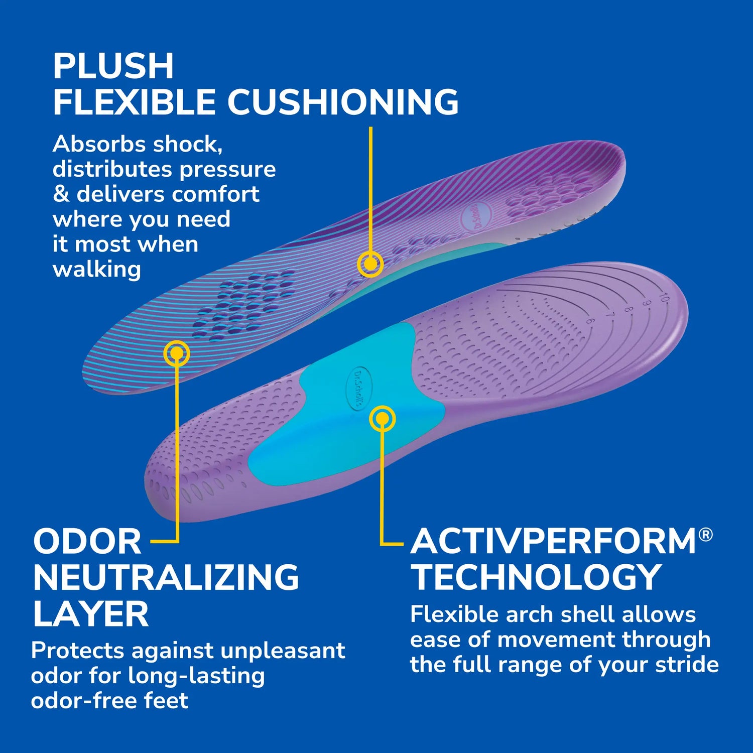 Dr. Scholl’s® Walk Longer Insoles provide superior cushioning that helps reduce muscle fatigue in your feet and legs so you can walk longer with greater comfort. Reduces stress and strain on your lower body while you walk. Helps relieve and reduce muscle soreness so you can enjoy walking day after day. Designed to protect each part of your foot through the full range of your stride with stimulating nodes for added responsiveness while walking.